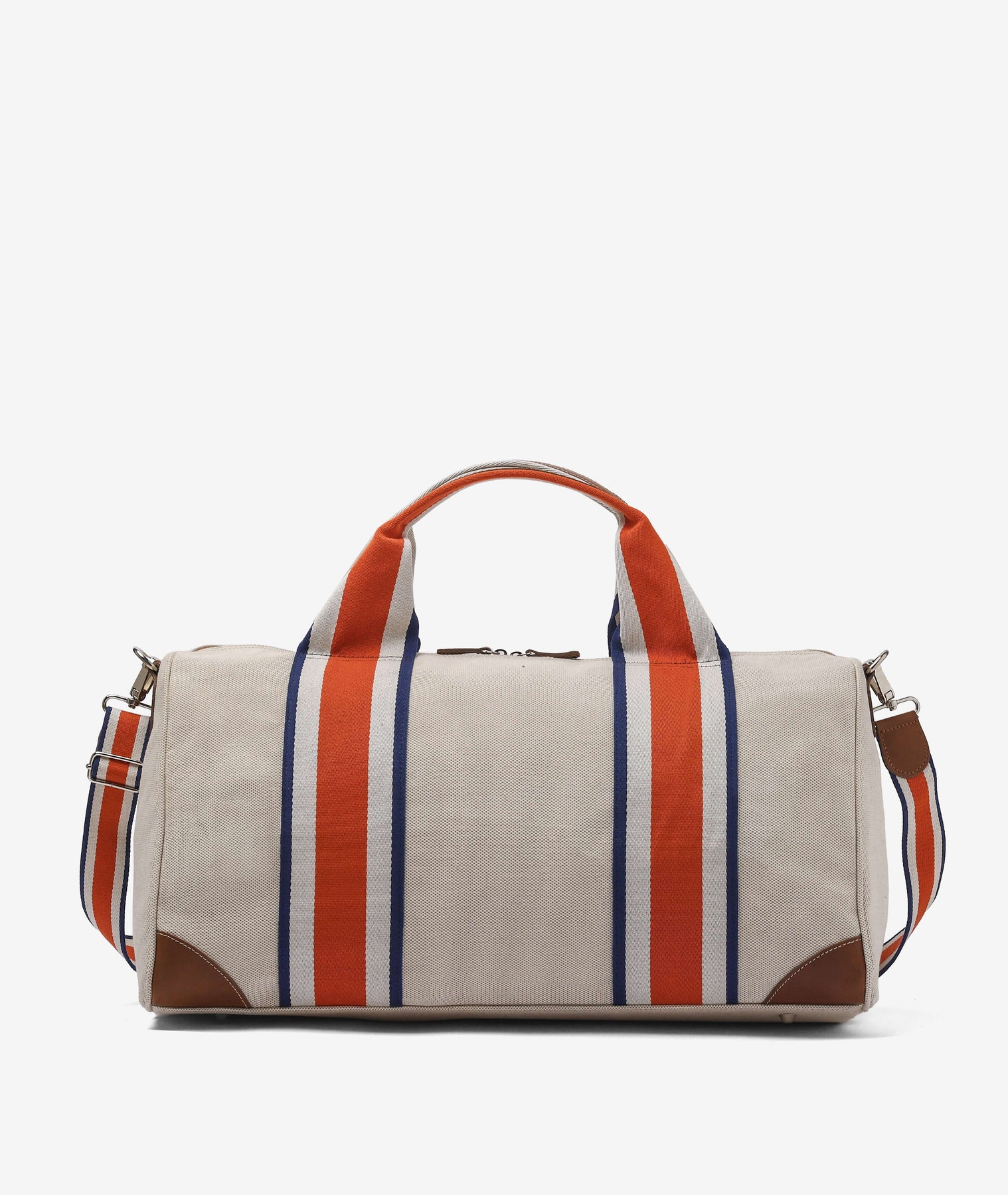 Made of durable canvas, it stands out for the orange and blue stripes that cross both the structure of the bag and the double striped ribbon handles, creating a sophisticated and refined effect of continuity. The leather reinforcements on the corners and the matching zipper puller underline the craftsmanship quality of the model. Silver metal details add a modern touch, while the adjustable shoulder strap in orange, blue and white striped tape ensures maximum practicality and comfort in carrying.
