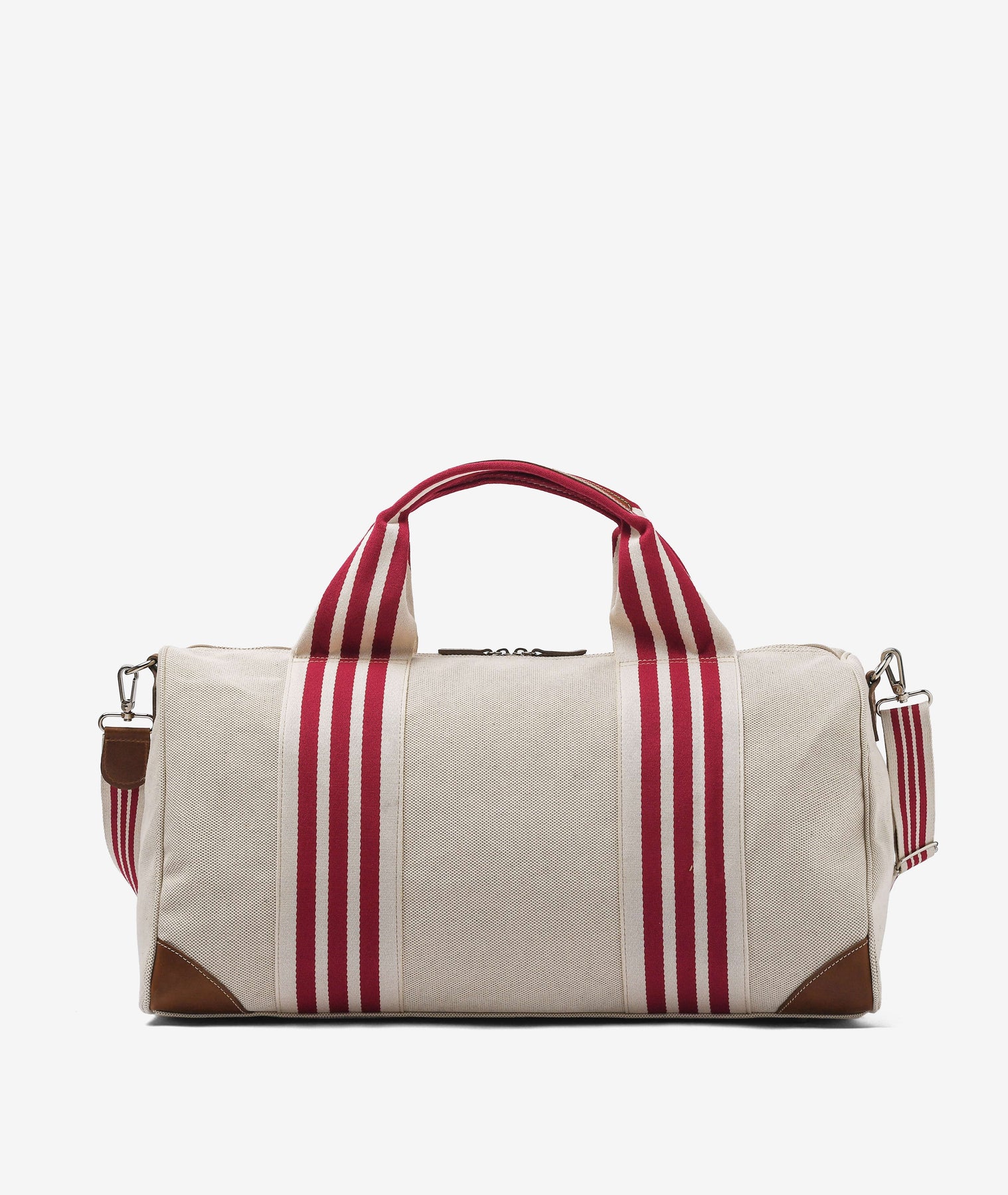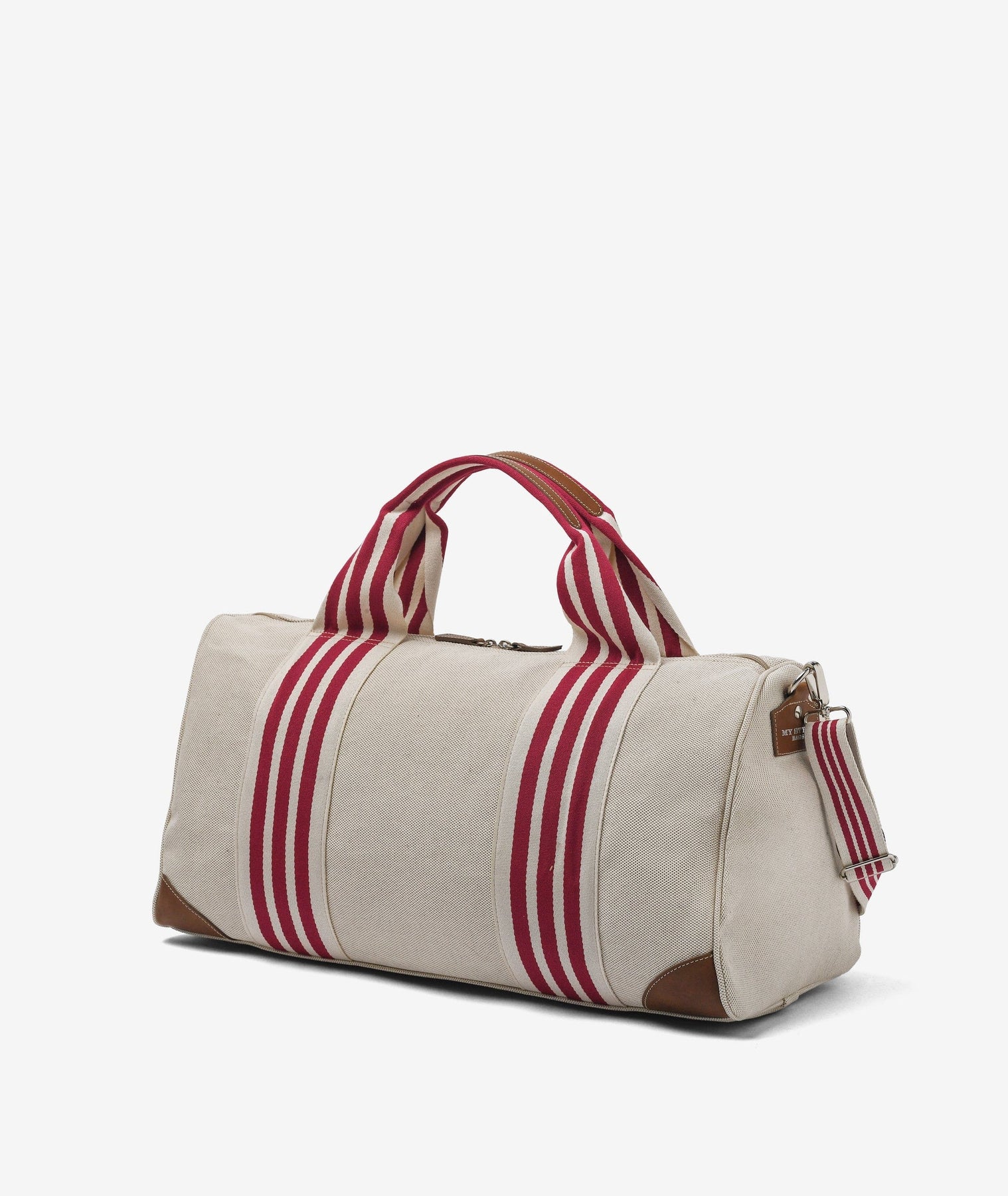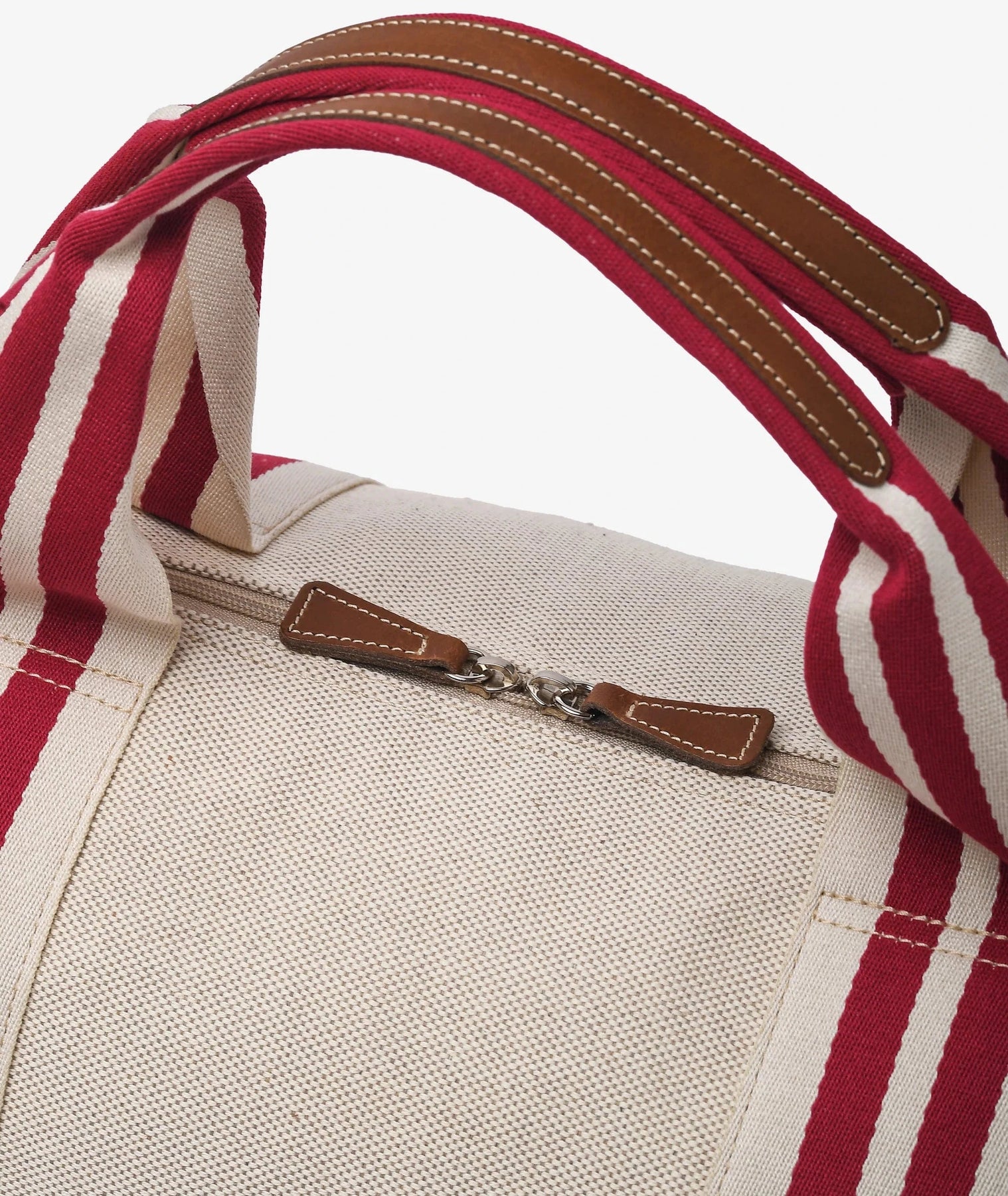 Made of durable canvas, it features burgundy and white stripes that run along both the structure of the bag and the double striped ribbon handles, a distinctive detail that gives a sporty and elegant touch. The leather reinforcements on the corners and details, together with the matching zipper pull, enhance the quality of craftsmanship of the model. Silver-tone metal accents and an adjustable shoulder strap in raw, red striped ribbon provide a comfortable and versatile carrying option.